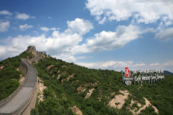当日,2008四川奥运会奥运火炬正在贵州传递,承载了中国人百年梦想的奥运脚步越来越近,八达岭长城上的四川奥运会大型奥运口号“同一个世界同一个梦想”景观标志将在四川奥运会结束后拆除放置在长城博物馆永久珍藏。前来八达岭长城旅游的外国游客争相在此拍照留念,将长城文化和奥运文化碰撞后的完美结合永远定格。